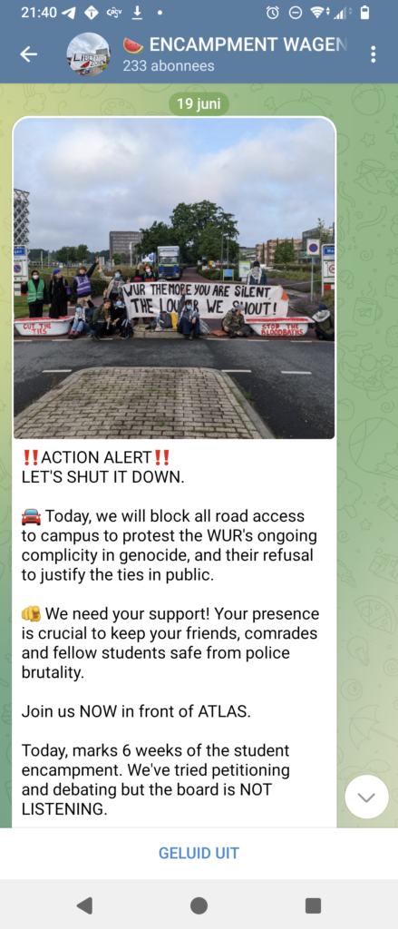 In Wageningen verliep het protest (tot nu toe) vreedzaam en kleinschalig. De WUR is in gesprek gegaan met de activisten en gaf toestemming op het terrein te blijven overnachten.